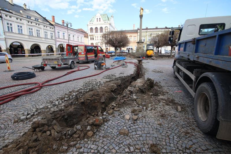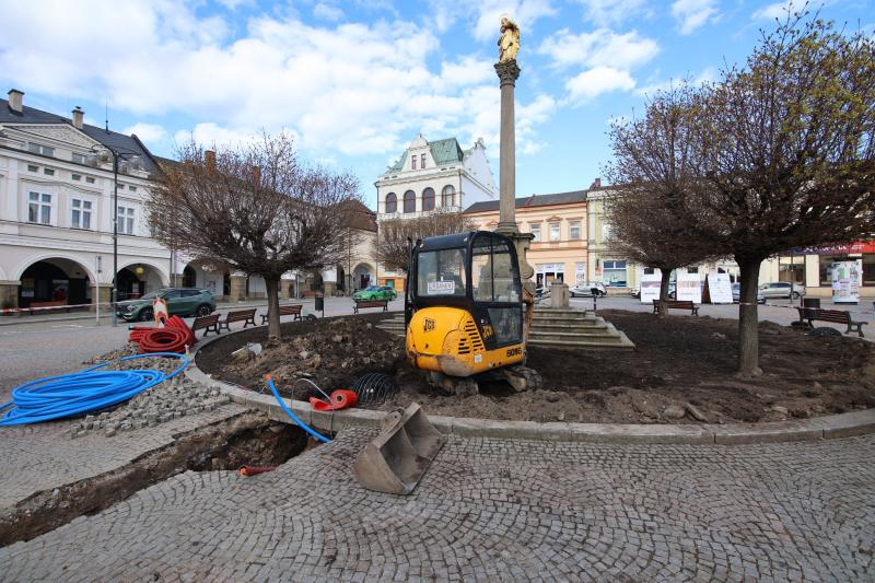 Na Mírovém náměstí byly zahájeny stavební práce, které souvisí s instalací dvou nových podzemních rozvaděčů. Ty budou využívány při venkovních akcích a díky tomu odpadne provizorní rozvod elektrické energie přes komunikaci. Napojení nových rozvaděčů bude provedeno z instalační krabice umístěné v nerezovém sloupku v podloubí čp. 7. Práce si tedy vyžádají nejen překop středu náměstí, ale také místní komunikace a dočasné omezení provozu a zabrání parkovacích míst. Současně se s rozvodem elektrické energie přivádí k centrálnímu záhonu u Mariánského sloupu také vodovodní přípojka.