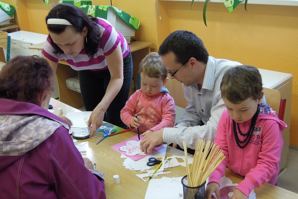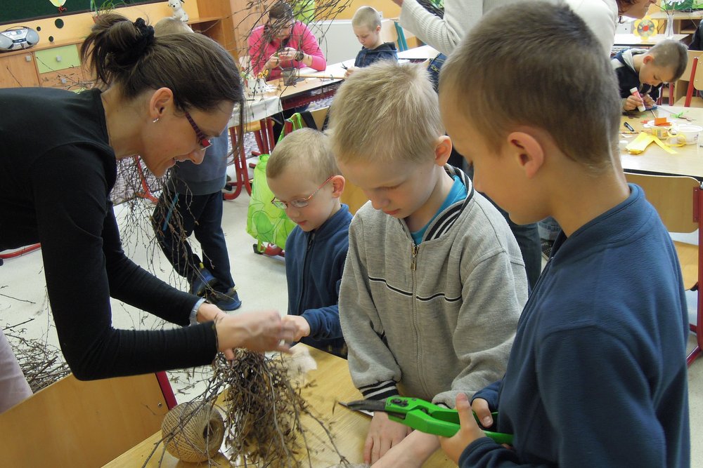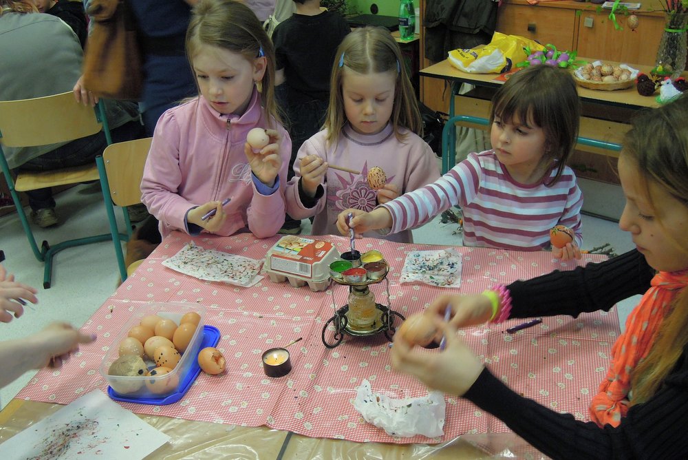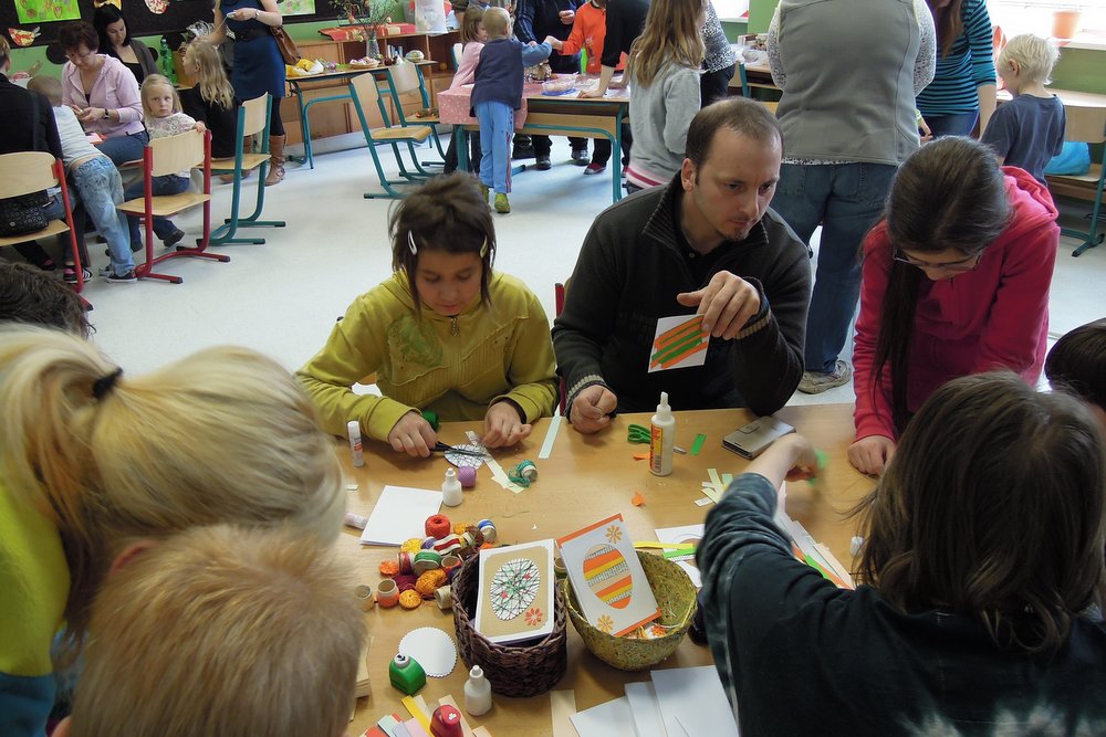 Velikonočně vyzdobená škola v Kerharticích se v pondělí 14. dubna otevřela pro rodiče s dětmi, aby zde vyzkoušeli své dovednosti při výrobě velikonočních dekorací. Ve třídách bylo vše připraveno a mohlo se začít! Zdobila se vajíčka tradiční voskovou technikou, vyráběla se velikonoční přáníčka a zápichy do květináčů. Z vlny se pomalu ale jistě „klubala" kuřátka nebo dokonce „vyskočil" zajíc. Hlavičky z pilin vyráběli ti nejmenší a na dospělé návštěvníky čekalo březové proutí a seno, ze kterého vykouzlili překrásné venkovní dekorace na dveře nebo zahradu. Fantazii při práci dokazovali všichni přítomní a tak není divu, že po náročné práci zašli na občerstvení v podobě velikonočního mazance a chutného, voňavého čaje. Celé odpoledne a podvečer se vydařil a školu navštívilo na sto návštěvníků.