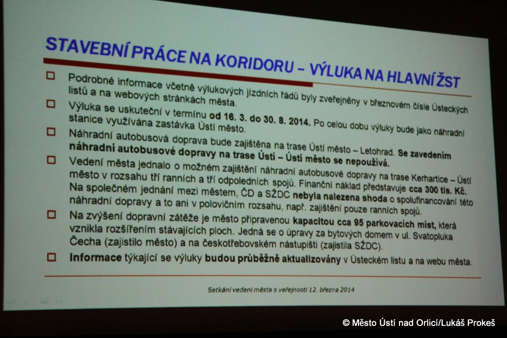Dalším zásadním bodem setkání byla informace o stavu stavby "Průjezdu železničním zlem Ústí nad Orlicí" a s ní spojeným uzavřením hlavního nádraží a přesunutí veškeré dopravy na zastávku Ústí nad Orlicí město. Ta převezme funkci hlavního nádraží v neděli 16. března a to na půl roku. V současné době jsou dokončeny stavební úpravy prostoru za bytovým domem v ulici Svatopluka Čecha, kde bylo vybudováno nových cca 30 - 35 parkovacích míst. Tyto úpravy navazují na celkovou obnovu lokality u železniční stanice Ústí - město, které se realizovaly v loňském roce a jsou hrazeny z rozpočtu města. Úpravy parkovací plochy přiléhající k nástupišti ve směru na Českou Třebovou realizuje po dohodě s městem dodavatel stavby „Průjezd železničním uzlem Ústí nad Orlicí" a finančně jsou zajištěny investorem stavby, tedy SŽDC s.o. V lokalitě železniční stanice Ústí - město bude pro období výluky zajištěno celkem cca 95 parkovacích míst (z toho 4 vyhrazená místa pro invalidy).