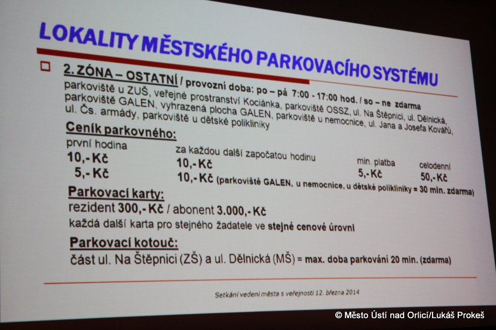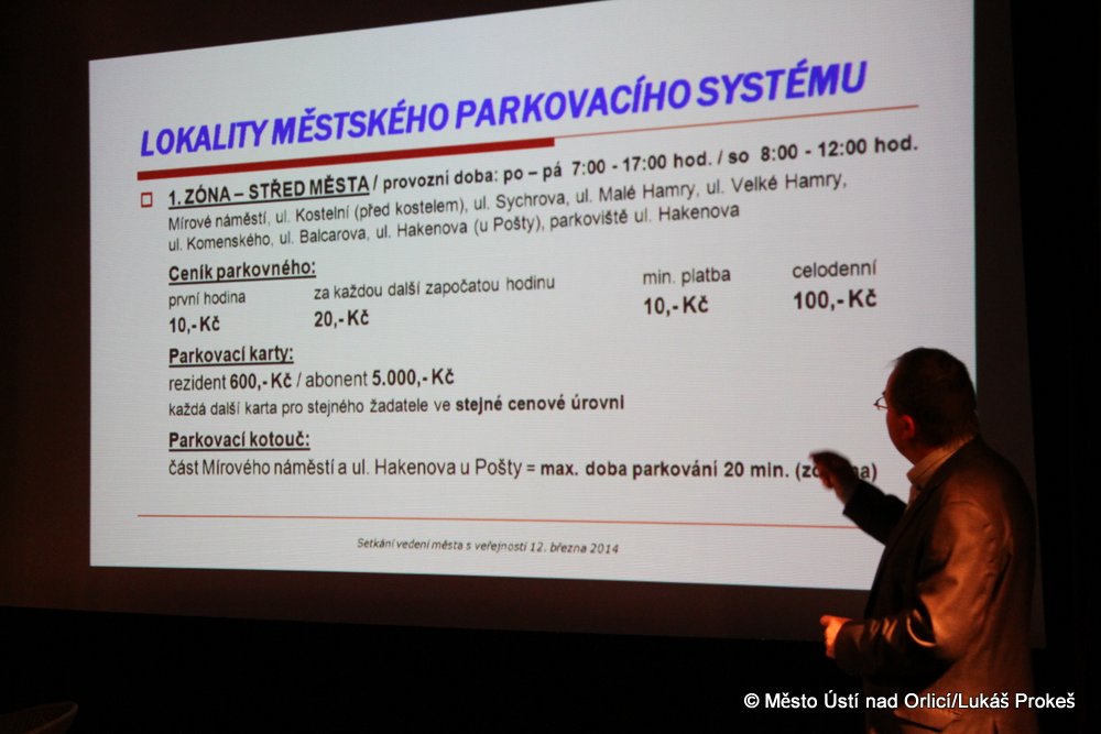 V pozadí samozřejmě nezůstal ani připravovaný parkovací systém, jehož koncepci na setkání podrobně prezentovat starosta Hájek. Parkování zdarma bude pro řidiče nadále umožněno v areálu Perly, kde vznikla nová parkovací kapacita, která má za cíl odlehčit centrum městě. Městský parkovací systém bude do ostrého provozu uveden od 1. 7. 2014. Podrobné informace k parkovacímu systému můžete v nejbližších dnech očekávat na našich internetových stránkách.