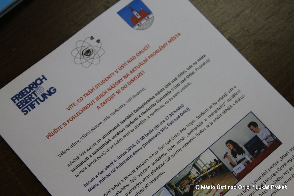 Skupina studentů Gymnázia v Ústí nad Orlicí se ve dnech 3. a 4. února zapojila do projektu simulační hry o komunální politice „Mladí lidé rozhodují". V pondělí 3. února se pod vedením odborných lektorů studenti seznámili fungováním komunální politiky a zúčastnili se také zasedání 21. zastupitelstva města. V úterý odpoledne pak zhodnotili zkušenosti z jednání, rozdělili se do fiktivních politických stran a připravili vlastní podněty a návrhy, kterými se zabývali na simulovaném jednání zastupitelstva pod vedením starosty města Petra Hájka. Zde se snažili prosadit vlastní návrhy a nápady. Cílem hry je přiblížit studentům jak funguje komunální politika, jak se do ní mohou mladí lidé zapojit a co by ve svém městě rádi změnili.