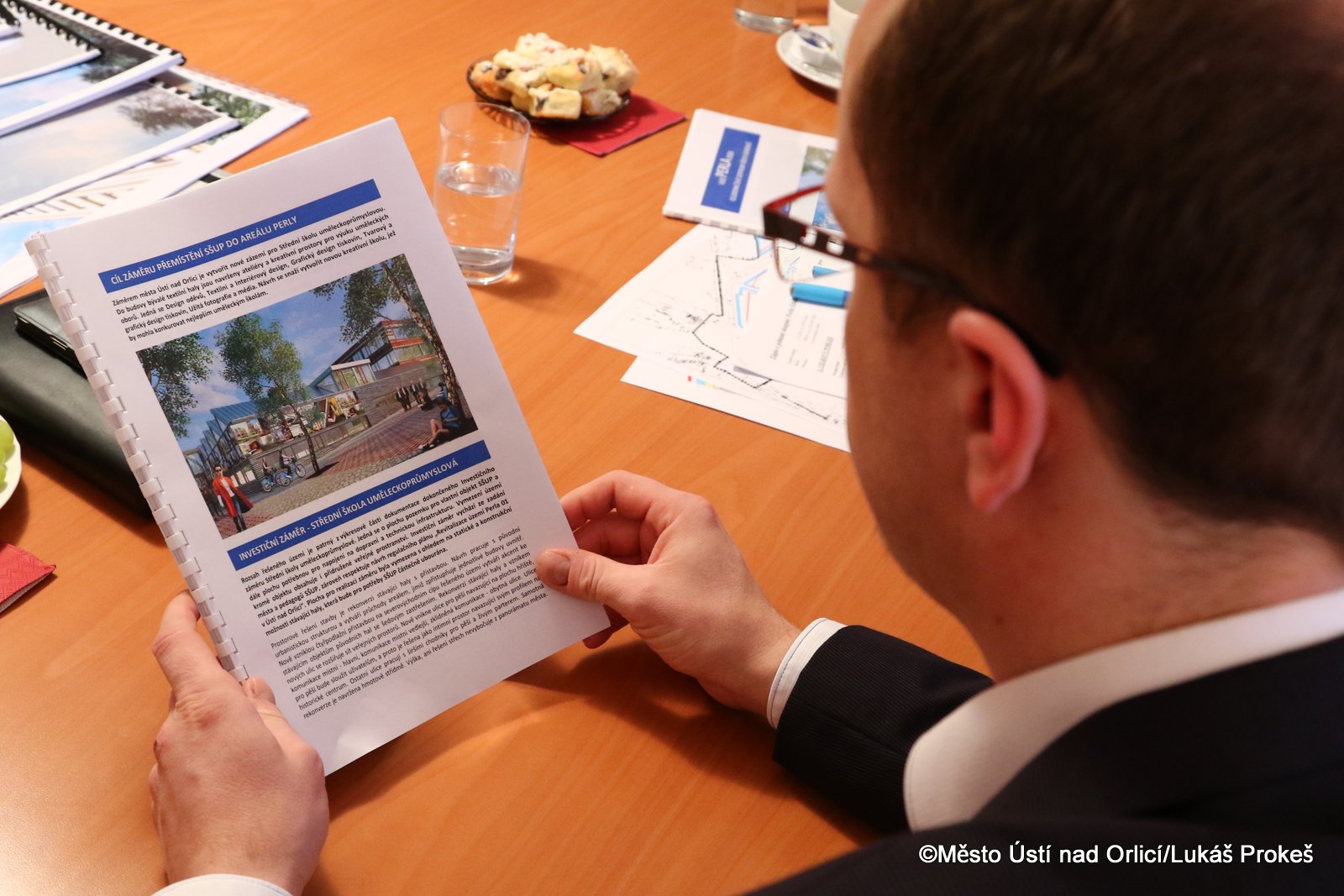 Setkání za přítomnosti místostarosty Jiřího Preclíka bylo zahájeno na radnici, kde se hejtman podrobně seznámil s dokončenými investičními záměry města a s návrhem revitalizace celého území. Detailně byla diskutována možnost přemístění uměleckých oborů Střední školy uměleckoprůmyslové do areálu Perly. Za tímto účelem se jednání účastnil ředitel SŠUP Zdeněk Rössler a vedoucí odboru školství Pardubického kraje Martin Kiss. Poté následovala prohlídka celého areálu Perly.
