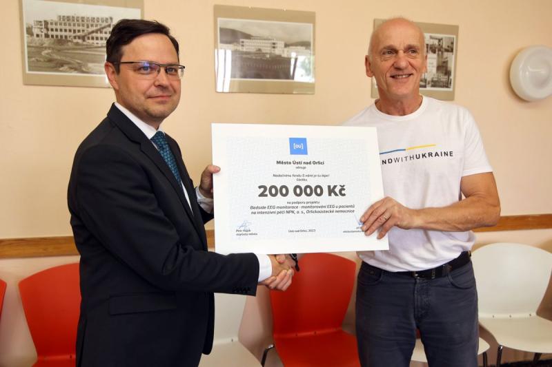 Z rukou místostarosty Ústí nad Orlicí Jiřího Preclíka a místostarostky sousední České Třebové Petry Válkové převzali zástupci nadačního fondu v čele s předsedou správní rady Kvido Štěpánkem symbolické šeky na celkem 400 tisíc korun.