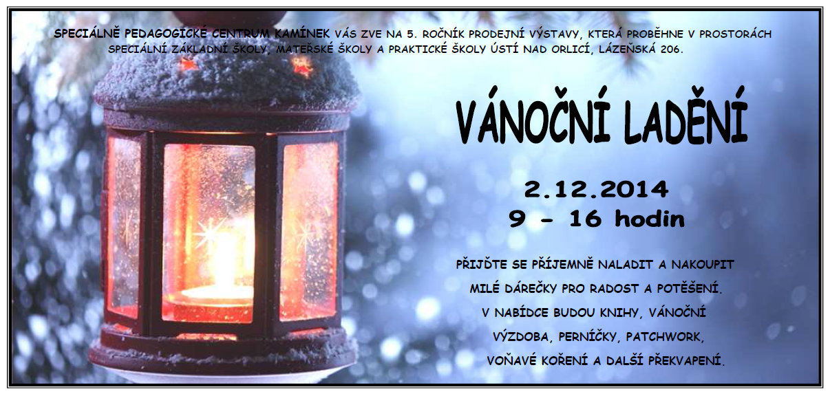 Pátý ročník vánoční prodejní výstavy, kterou pořádá Speciálně pedagogické centrum Kamínek v Ústí nad Orlicí proběhne 2. 12. 2014 od 9-16 hodin v prostorách Speciální základní školy Ústí nad Orlicí (dříve Zvláštní škola). K zakoupení budou vánoční dárky, ozdoby, perníčky, knihy, výrobky z patchworku, voňavé koření a další překvapení.