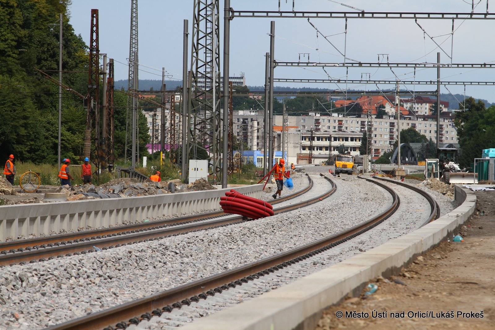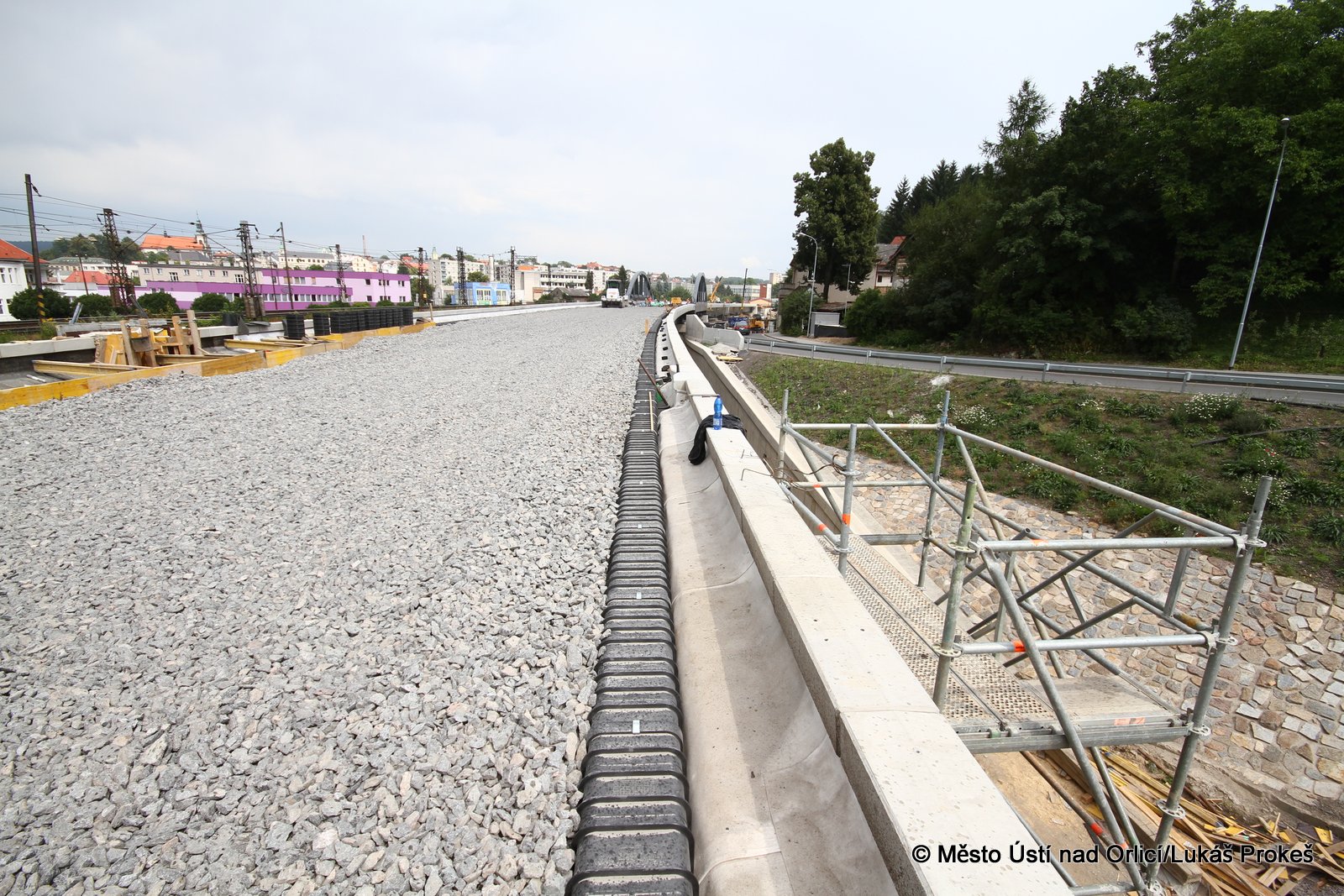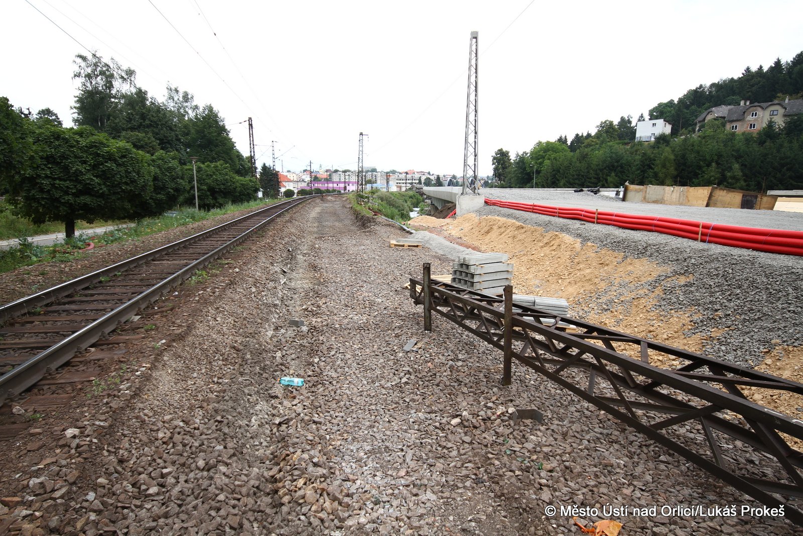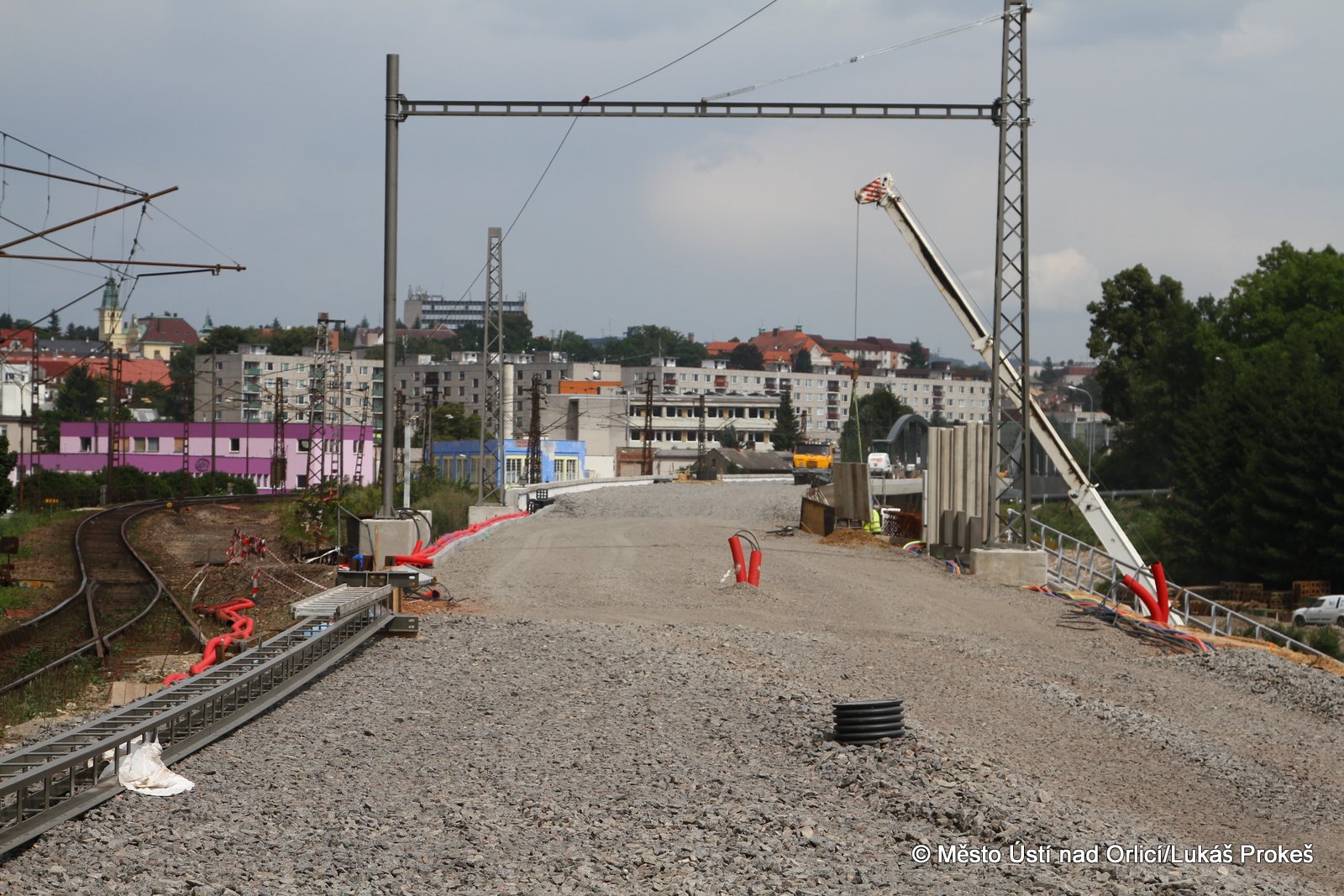 Přinášíme aktuální informace a postup stavby "Průjezd železničním uzlem Ústí nad Orlicí". Železniční estakáda vedoucí přes Mendrik je stavebně již hotova a v současné době se pracuje na pokládce samotné železnice. Estakáda půjde do provozu začátkem září, kdy po ní začnou jezdit vlaky a nahradí tak stávající kolejiště, které se následně začne odtěžovat a v podstatě téměř celé zmizí. Pod dohledem památkářů bude rozebrán také pěti obloukový most.