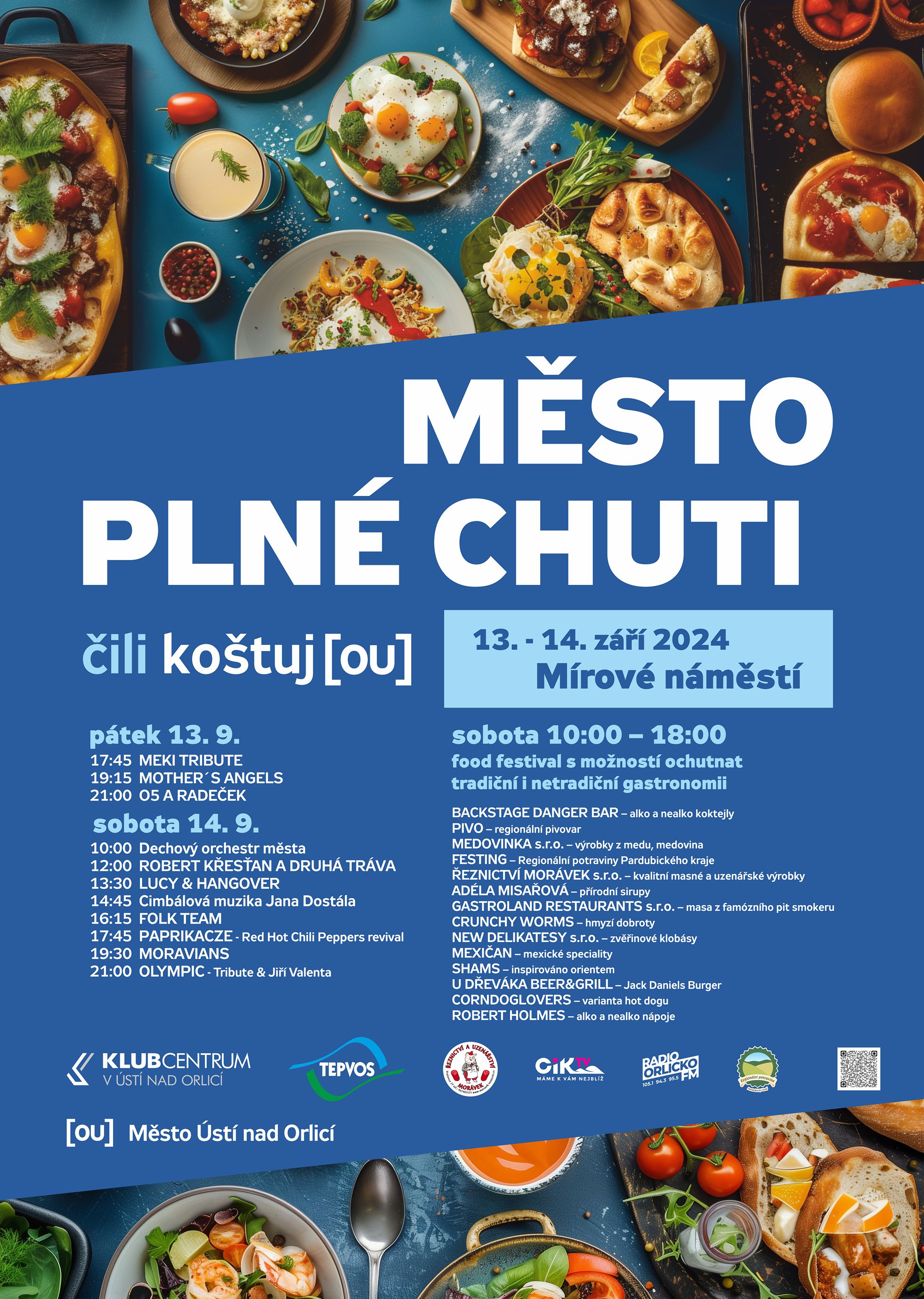 Září zpestří v Ústí nad Orlicí nový food festival. Město připravilo na 13. a 14. září novou akci food festival nazvaný Město plné chuti čili koštuj[ou]. Zahájen bude pátečními koncerty skupin O5 a Radeček, MEKI tribute a Mother‘ s Angels. Pokračovat bude v sobotu na Mírovém náměstí, kde bude možné ochutnat pokrmy z tradiční i netradiční gastronomie nebo regionální pivo. Akci doplní kulturní program sestavený z vystoupení profi skupin a místních kapel, diváci se mohou těšit na Olympic tribute nebo kapelu Moravians.