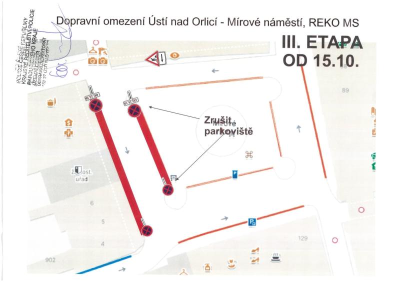 - Třetí etapa: zhruba od 15. 10. 2024, zahájena bude po dokončení rekonstrukce střechy na budově čp. 7, trasa povede ke Katastrálnímu úřadu