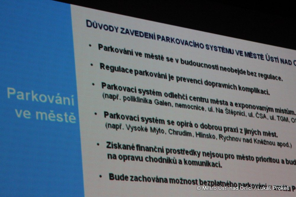 Poslední ale o to zásadnější informací byla prezentace záměru regulace dopravy v klidu - městský parkovací systém. Starosta Hájek prezentoval podrobně plán zavedení městského parkovacího systému spojeného se zpoplatněním parkování v dané zóně v roce 2014. O podrobnostech spojených s novým parkovacím systémem budeme informovat na webu města.
