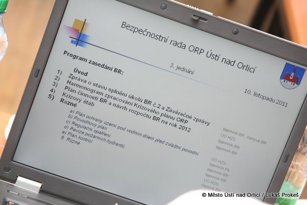 Ve čtvrtek 10. listopadu jednala Bezpečnostní rada ORP na svém 3. řádném zasedání. Po úvodních zprávách o situaci ve správním území schválila novou podobu Krizového štábu, Povodňový plán a Regulační opatření. Dále byl projednán Plán činnosti na rok 2012 a Návrh rozpočtu. Zástupce HZS Pardubického kraje seznámil přítomné s Plánem ochrany území pod vodním dílem před zvláštní povodni a Harmonogramem zpracování Krizového plánu na základě novely zákona č. 240/2000 Sb.
