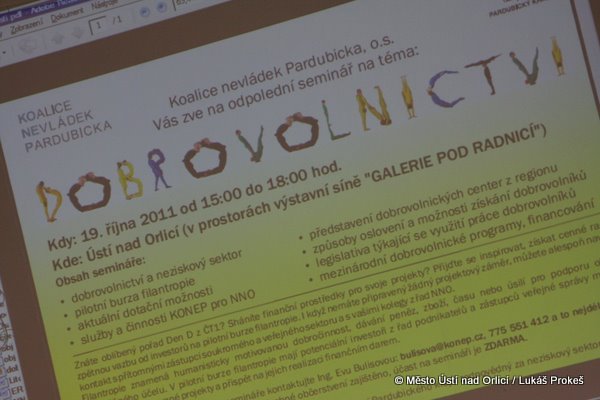 Ve středu 19. října se na ústecké radnici uskutečnil seminář určený pro dobrovolnický a neziskový sektor. Na programu semináře byla pilotní burza filantropie (humanisticky motivované dobročinnosti) na které měli investoři z řad podnikatelů a zástupců veřejné správy možnost ohodnotit představené projekty a přispět na jejich realizaci finančním darem. Na programu semináře dále byly informace o aktuálních dotačních možnostech, způsoby oslovení a možností získání dobrovolníků a související legislativa a mnoho dalších informací důležitých pro neziskové organizace.