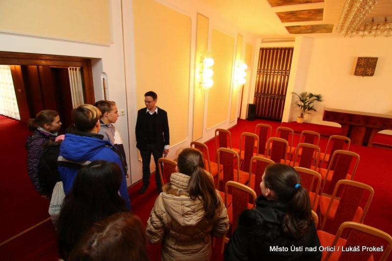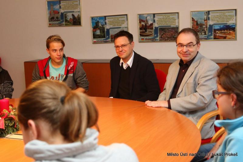 Vedení města Ústí nad Orlicí v úterý 6. prosince přijalo žáky 8. a 9. ročníků Základní školy Komenského Ústí nad Orlicí, kteří radnici navštívili v rámci projektu školy "Den jinak". Děti měly možnost se zeptat starosty a místostarosty města na otázky, které je zajímaly. Ptali se například jak se připravují kulturní akce ve městě (Ústecký advent, Město v pohybu), výše ročního rozpočtu města, jak se člověk může stát politikem - starostou, ale i úhrady místní poplatků za komunální odpad nebo ceny vodného a stočného. Na závěr se uskutečnila prohlídka budovy radnice.