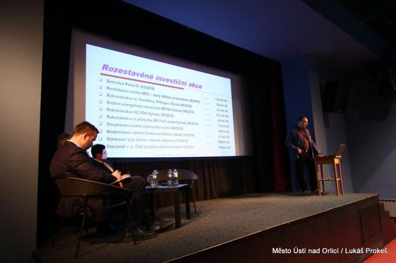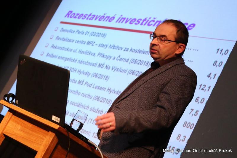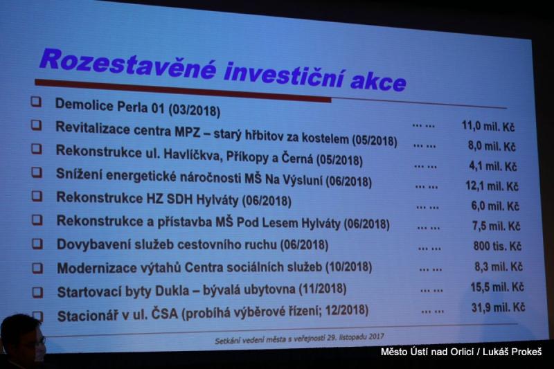 Starosta v první řadě informoval o dokončených investičních akcích a opravách a o zahájených a probíhajících investičních akcích. Dokončené akce a opravy si v roce 2017 vyžádaly přes 50 milionů korun z rozpočtu města. Patří mezi ně například opravy komunikací, výstavba společensko-kulturního sálu v Knapovci, přemístění školní jídelny, rekonstrukce ulice ČSA a další.