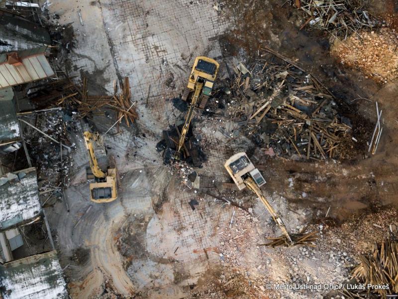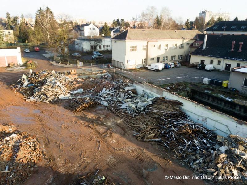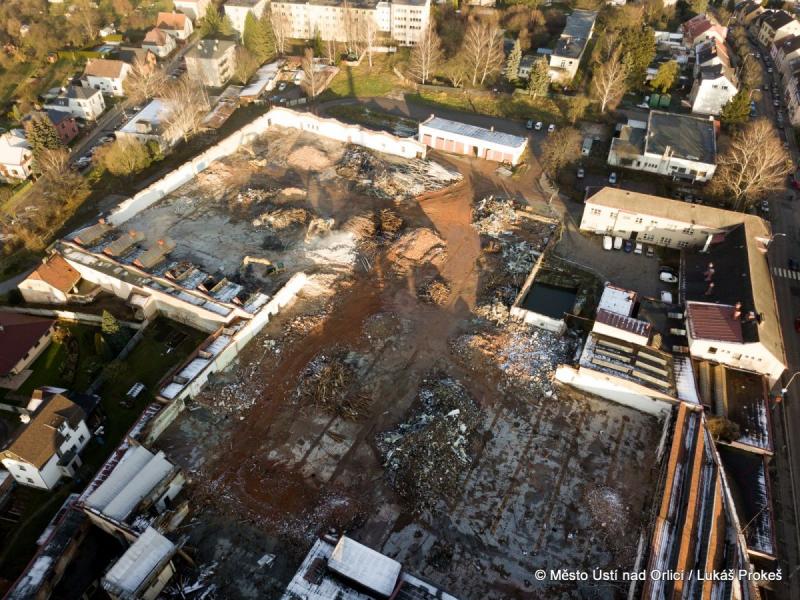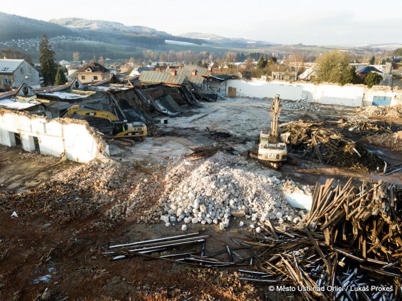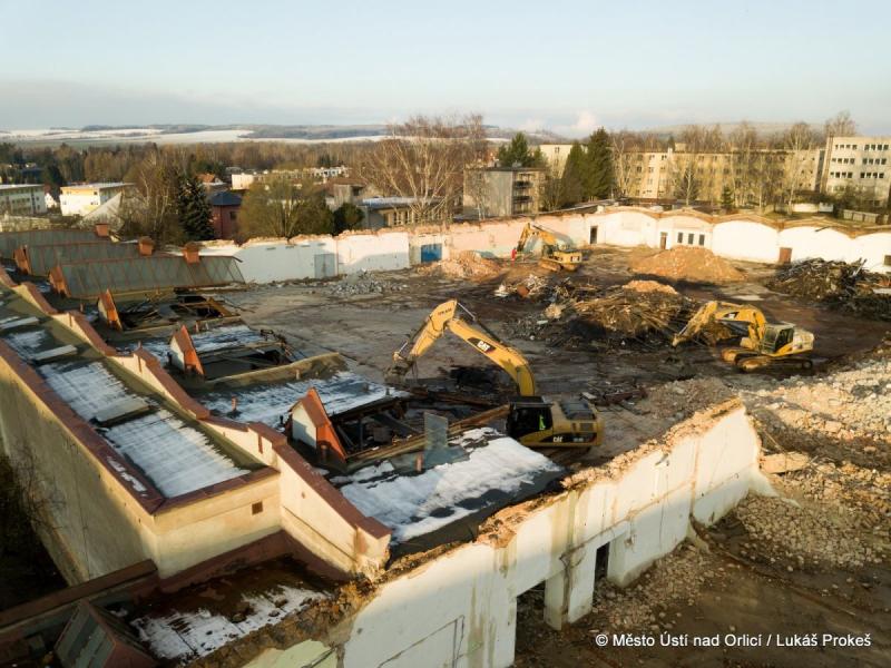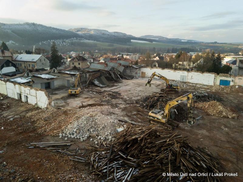 Se začátkem prosince se demoliční práce v areálu bývalé textilky v centru Ústí nad Orlicí dostaly do fáze, kdy jsou odstraněny již všechny výrobní haly. Bude následovat demolice zbývajících budov a začnou práce na demolici podlah a základů. Při těchto pracích zůstanou stát ještě některé obvodové zdi, které budou stínit hluk a prach.