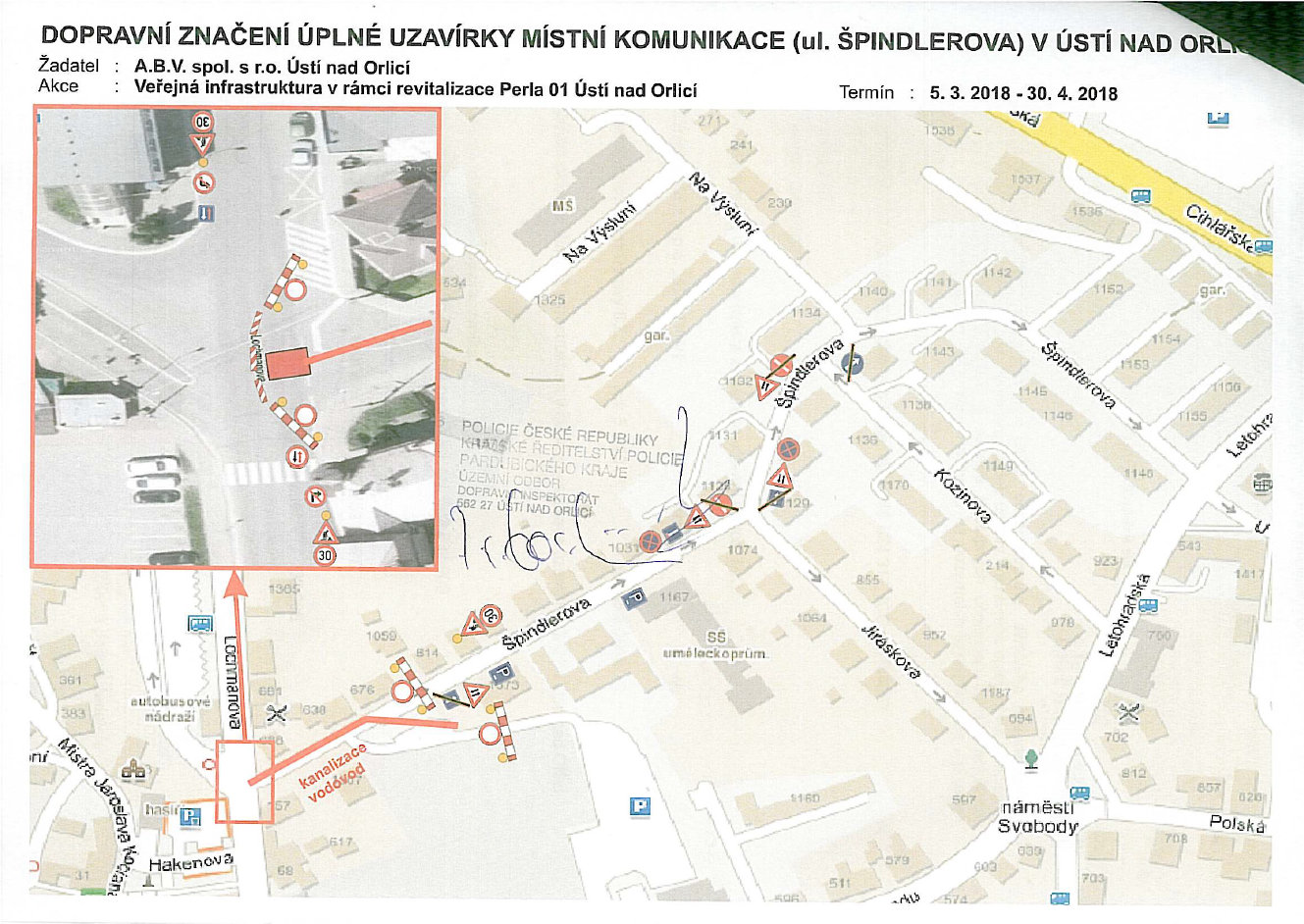 Od úterý 3. dubna 2018 musí řidiči počítat s uzavírkou v ulici Špindlerova v Ústí nad Orlicí. Do 31. května bude z důvodu stavby vodovodu a kanalizace v rámci akce revitalizace území Perla 01 uzavřený úsek od křižovatky s ul. Lochmanova po čp. 676, po ulici Kozinova bude část ulice Špindlerova zobousměrněna. Věnujte prosím pozornost dopravnímu značení a úpravě místní dopravy. Vše bude značeno příslušnými dopravními značkami.