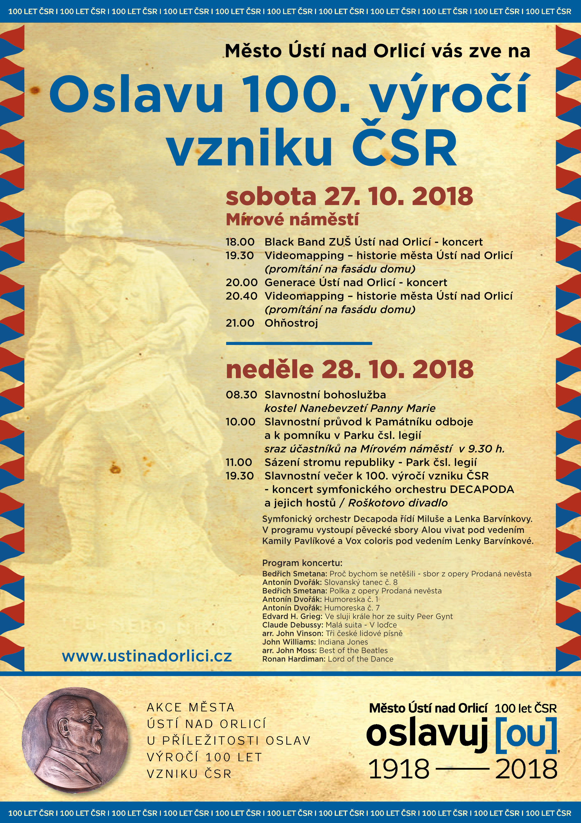 Zveme Vás na oslavy 100. výroční vzniku samostatného Československého státu, které se v Ústí nad Orlicí uskuteční v sobotu 27. a neděli 28. října. Připraven je bohatý program ve kterém nebude chybět slavnostní průvod, vysazení stromu republiky, koncerty, ohňostroj nebo videomapping věnovaný historii města.