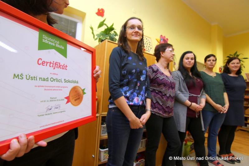 Během odpoledne se také uskutečnilo slavnostní předání bronzového certifikátu Skutečně zdravé školy, který naše mateřská škola získala od spolku usilujícího o zkvalitnění školního stravování. Program, jehož kritéria školka splnila, zahrnuje nejen změnu v jídelně - ve prospěch zdravějších pokrmů vařených ze surovin od regionálních dodavatelů, ale i rozšířené vzdělávání o jídle. Splněná kritéria zahrnují omezení cukru, soli, nepřítomnost konzervačních látek, vaření z čerstvých, nezpracovaných surovin, podávání pouze nedoslazovaných nápojů apod. Plnění programu vyžaduje maximální nasazení, kreativitu a odpovědný přístup všech zaměstnanců školy i součinnost rodičů.