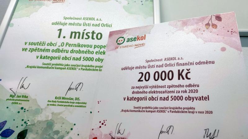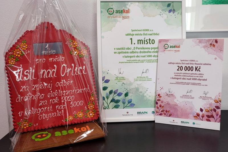 Město Ústí nad Orlicí obhájilo, v soutěži „O Perníkovou popelnici 2021", 1. místo ve zpětném odběru drobného elektrozařízení za rok 2020 v kategorii obcí nad 5000 obyvatel. Součástí ocenění je také dar v hodnotě 20 000 Kč od společnosti ASEKOL a.s., které budou využity na osvětovou činnost v oblasti odpadového hospodářství.