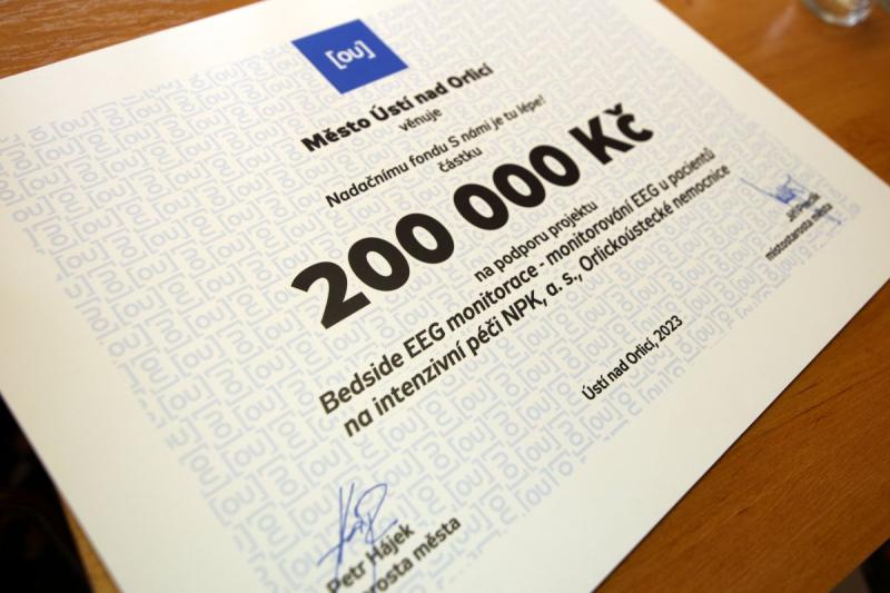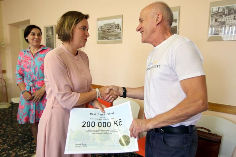Z rukou místostarosty Ústí nad Orlicí Jiřího Preclíka a místostarostky sousední České Třebové Petry Válkové převzali zástupci nadačního fondu v čele s předsedou správní rady Kvido Štěpánkem symbolické šeky na celkem 400 tisíc korun.
